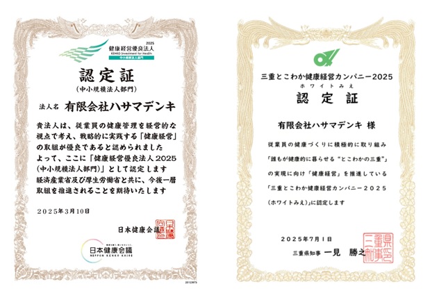 「三重とこわか健康経営カンパニー」、「健康経営優良法人(中小規模法人部門)」に認定をいただきました。