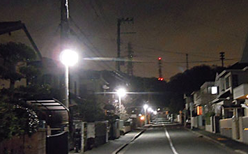 住宅街の夜間の道路などを明るく照明し、防犯に寄与しています。